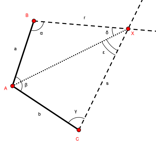 Note le incognite il problema è risolto, poichè basta applicare il teorema dei seni per calcolare le distanza AX, BX e CX. Il punto X si trova nella intersezione delle semirette r e s.