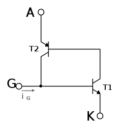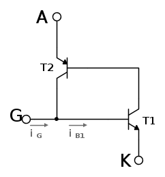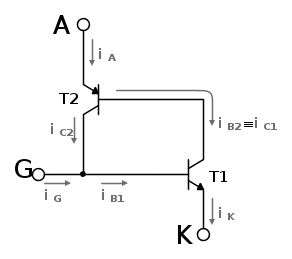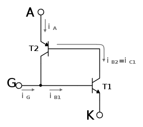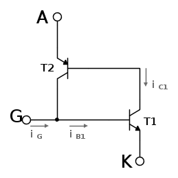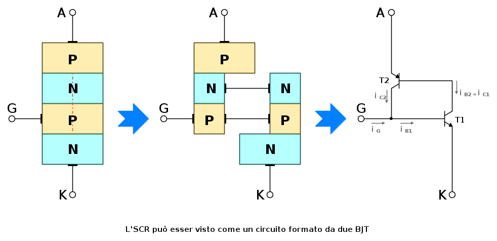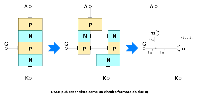 Si può immaginare l'SCR sezionato, in modo che si possa dare origine a due BJT, uno di tipo PNP e l'altro NPN, connessi in maniera che la base di uno costituisca il collettore dell'altro e viceversa.