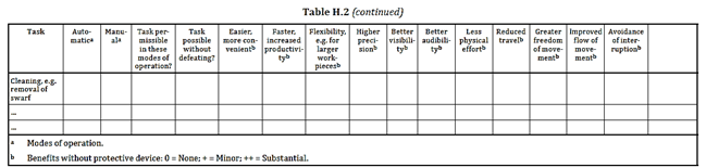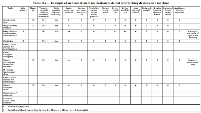 L'allegato H della norma UNI EN ISO 14119:2013 riporta un esempio di metodo per identificare le motivazioni di elusione dei dispositivi di interblocco (per una macchina automatica):