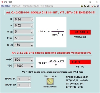 La soglia 51.S1 può anche non essere attivata, come spiegato di seguito. Infine non viene indicato un tempo d'intervento del SPG perchè questo, essendo inversamente proporzionale alla corrente, dipende dalla corrente Ip o I-test che si inietta nella PG durante la prova.