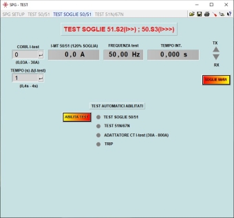 Per abilitare questa pagina devono essere disabilitati i test automatici delle soglie 50/51 e 51N/67N. Da questa pagina si eseguono i test delle funzioni protettive indicate secondo gli artt. C.4.2.1, C.4.2.2 e C.4.2.3 della norma CEI 0-16. La corrente di prova desiderata (iniezione secondaria negli ingressi amperometrici della PG) si inserisce nella finestra "CORR. I-test" e quindi si preme "TEST 50/51" per inviare i dati delle grandezze di prova alla cassetta. I risultati del test, se l'SPG è intervenuto, si leggono nelle rispettive finestre "I-MT" e "TEMPO INT.". Se nella finestra SPG SETUP è stato impostato il rapporto dei TA collegati alla PG, la misura di corrente rilevata viene automaticamente riportata al livello MT.