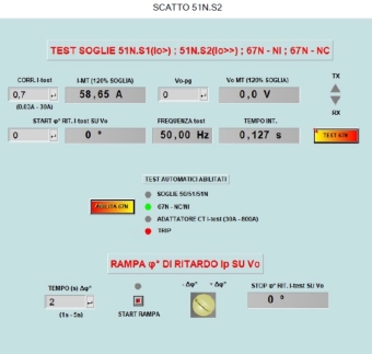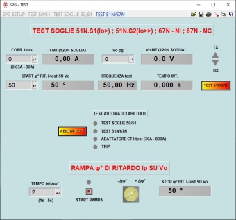 La pagina deve essere abilitata con il pulsante "ABILITA TEST" per essere attiva. Da questa pagina di eseguono i test delle funzioni protettive 51N secondo gli artt. C.4.2.4 e C.4.2.5 della norma CEI 0-16. L'iniezione di corrente nella PG, visto il valore di corrente di pochi mA necessaria per il test 51N.S1 (Io>), può essere fatta tramite TO ausiliario 100/1 A oppure direttamente nell'ingresso amperometrico omopolare della PG per il test 51N.S2 (Io>>). In questo secondo caso se nella finestra SPG SETUP è stato impostato il rapporto del TO collegato alla PG, la misura di corrente rilevata viene automaticamente riportata al livello MT. Da questa pagina di eseguono inoltre i test della funzione protettiva 67N delle due soglie 67N-NC e 67N-NI secondo gli artt. C.4.2.6 e C.4.2.7 della norma CEI 0-16 seguendo la modalità di prova alternativa finalizzata alla sola verifica delle tarature previste dalla norma CEI 0-16.