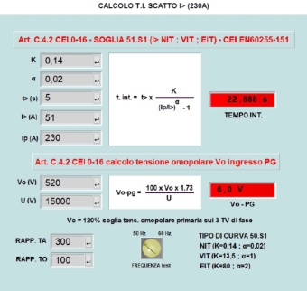 Con i parametri impostati nella PG : curva NIT ; t>=5 s ; I>=51 A per Ip=230 A (I-test) si ottiene t.i.=22,888 s.