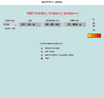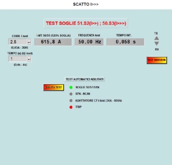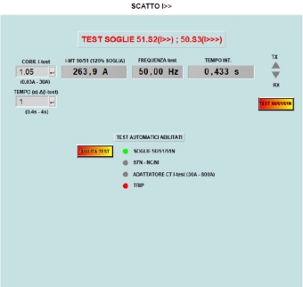 La pagina deve essere abilitata con il pulsante "ABILITA TEST" per essere attiva. Da questa pagina di eseguono i test delle funzioni protettive a tempo indipendente secondo gli artt. C.4.2.2 e C.4.2.3 della norma CEI 0-16. La prova è identica a quella della pagina precedente, ma ora la corrente di test viene applicata agli ingressi amperometrici della PG solo per un determinato tempo (selezionabile) : se questo tempo è superiore al tempo di ritardo d'intervento impostato nella PG allora l'SPG interviene (TRIP), altrimenti la soglia viene attivata (START) ma l'SPG non interviene (NO TRIP).