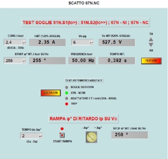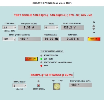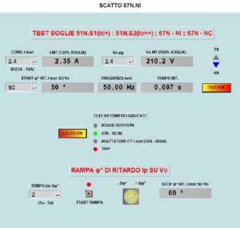 I parametri impostati nella PG per la soglia 67N-NI : Io>=2 A ; Vo=2 V ; t.i.=0,1 s ; settore angolare 60° - 120°. La prova viene fatta aumentando del +20% i valori delle soglie Io> e Vo per le grandezze generate dalla cassetta prova relè applicate contemporameamente alla PG. Lo sfasamento impostato è di Io> in ritardo di 90° rispetto a Vo.