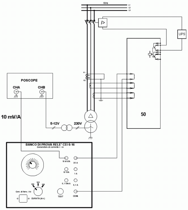 L'Allegato B della norma CEI 0-16 dice che bisogna iniettare in un ingresso amperometrico della PG una corrente pari a 1,2 volte il valore della soglia di scatto istantaneo per un tempo di 100 ms (50.S3 o I>>> solitamente tarata a 600 A e quindi corrente di prova primaria di 1,2x600=720 A che all'ingresso amperometrico della PG corrisponde a 12 A se sono montati TA 300/5 oppure 2,4 A con TA 300/1). Quindi si deve fare una registrazione dell'intervento del SPG misurando il tempo tra l'istante di applicazione del segnale di iniezione di corrente e l'estinzione della tensione prelevata dal secondario del TRF MT/BT di cabina. Detto tempo non deve essere superiore a 200 ms e devono essere fatte tre aperture con una dispersione massima dei tempi d'intervento non superiore al 20%. In pratica il circuito di prova è il seguente.