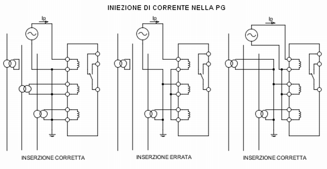 Gli scomparti MT prefabbricati hanno di solito un cassonetto segregato dove è alloggiata la protezione con tutta la circuiteria degli ausiliari per la gestione dell'interruttore MT (isolato in SF6 od in vuoto i VOR sono ormai abbandonati), ivi compresa la morsettiera cortocircuitabile sulla quale sono attestati i conduttori provenienti dai TA di fase (2 o 3 a seconda se la rilevazione della sovracorrente di linea è bipolare o tripolare) e dal TO omopolare. Quando di inietta la corrente di prova nella PG, e per fare questo si scollegano da essa i secondari dei trasformatori di corrente, è sempre necessario CORTOCITCUITARLI per evitare che funzionino a circuito aperto. Quando sono presenti solo 2 TA su due fasi la corrente nella terza fase è ricavata per somma delle altre due. In questo caso non è possibile iniettare la corrente di prova direttamente sui morsetti cortocircuitabili perchè così facendo la corrente attraverserebbe non solo la fase direttamente interessata ma anche le altre due ed il secondario dell'altro TA. Lo schema seguente chiarisce quanto ora detto.