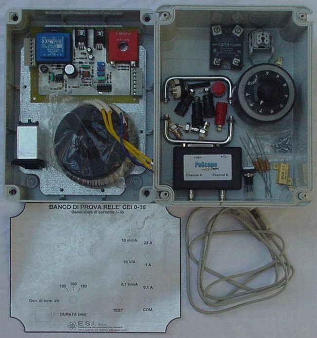 Il kit comprende tutti i principali componenti per la realizzazione della cassetta prova relè che genera la corrente da iniettare nella PG con funzioni protettive 50-51-51N. La corrente erogata per i tempi previsti dalla CEI 0-16 Allegato B (100ms, 160ms e 180ms con passaggio per lo zero) ha valore regolabile da zero ad un massimo di circa 25 Arms (la soglia istantanea 50.S3 o I>>> non supera mai generalmente 650 A lato MT o 13 A di prova nella PG con TA 300/5) e quindi soddisfa tutte le ordinarie esigenze di misura. Il kit contiene quello che si vede in foto :