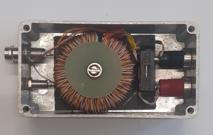 Il motivo di avvolgere sul toro una coppia di doppini bifilari singolarmente twistati e disposti in parallelo è per avere l'impedenza caratteristica equivalente di 50 Ω dell'avvolgimento così realizzato. Si potrebbe obiettare che usando un cavo RG174 nativamente con Zo di 50 Ω si otterrebbe lo stesso risultato, ma in questo modo si aumenterebbe anche la capacità tra primario e secondario del TRF che invece deve essere la minima possibile. Non ultima considerazione è che l'RG174 è più ingombrante dei due doppini affiancati e che le 42 spire di progetto riempirebbero quasi completamente il foro interno del toro con un avvolgimento non proprio ordinato (ho fatto un tentativo di prova poi abbandonato.....) richiedendo pure un contenitore più grande di quello scelto.