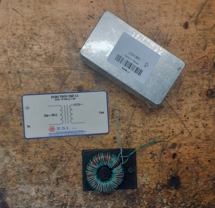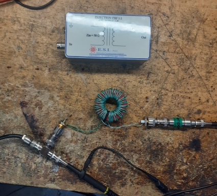 Fondamentalmente il trasformatore d'iniezione (injection transformer) serve per rendere flottante l'uscita (OUT), rispetto al suo ingresso (IN). L'ingresso (IN) viene collegato al generatore AWG (50 Ω) del DSO e l'uscita (OUT) è chiusa sull'impedenza caratteristica (resistenza 50 Ω) per generare ai suoi capi la tensione d'ingresso da iniettare nell'anello di retroazione del sistema di cui si vuole tracciare il diagramma di Bode (modulo e fase). Rispettare l'adattamento d'impedenza a 50 Ω è obbligatorio per avere la massima danda passante del circuito d'iniezione, evitando fenomeni di riflessione e risonanze indesiderate nel circuito.