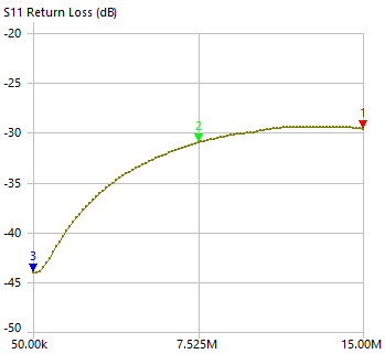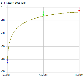 La dimostrazione di quanto sopra detto è evidente collegando 3,5 m di singolo doppino twistato con ai capi due connettori SMA, collegati entrambi tra PORT1 e PORT2 di un nanoVNA. La frequenza di sweep nei due grafici varia tra 50 kHz e 15 MHz.