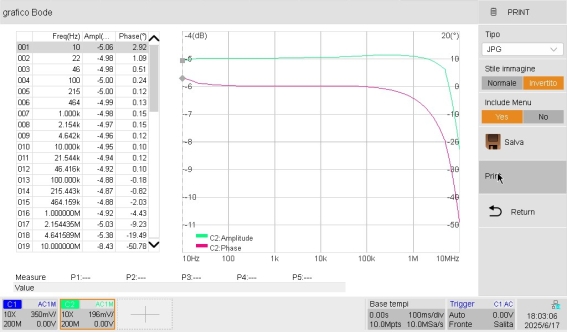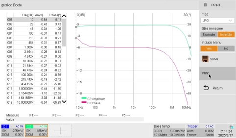 La funzione Bode Plot dell'oscilloscopio traccia automaticamente il grafico del rapporto delle ampiezze di V2/V1 espresso in dB insieme al rispettivo sfasamento espresso in ° (gradi sessagesimali) nel campo di frequenza compreso tra 10 Hz e 10 MHz (impostabile a piacere).