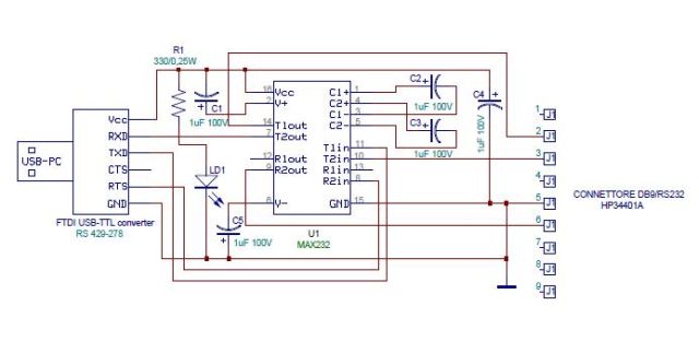 Il modulo USB-TTL specificato nello schema è della FTDI, cod. RS 429-278, (lo avevo in casa.....) ma penso che possa andare bene qualsiasi altra cineseria, basta che siano disponibili i pin CTS/RTS per l'handshake perchè l'HP34401A richiede per la comunicazione attraverso la RS232 un collegamento particolare come da schema.
