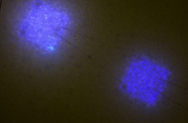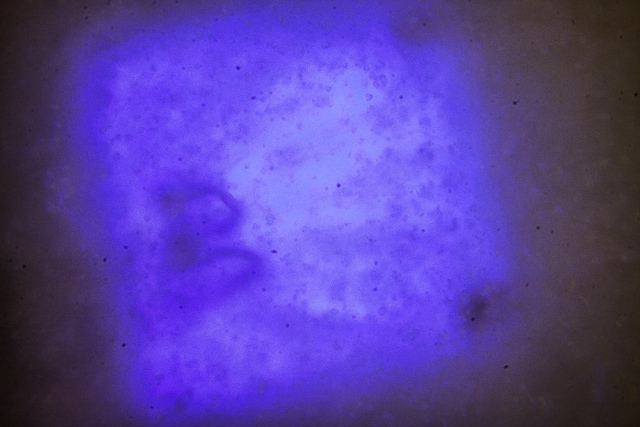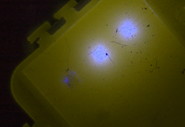 Per curiosità riporto una foto (fortemente ritagliata) di LED UV da...non saprei, circa 50 mW, scattata in occasione dell'assemblaggio di un bromografo.