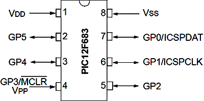 Il pin 8 del PIC12F683 è GND. Sul pin 2 vi sono GP5, T1CKI, OSC1, CLKIN. Useremo il pin 2 per GP5.