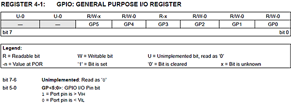 Guardando la struttura del registro nell'immagine soprastante si nota come GP5 sia il pin 6 a partire da destra.