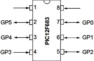 Il PIC12F683 ha 6 porte di GPIO. Si può agire indipedentemente su ogni porta, alzandola a VDD ("1") o abbassandola a GND ("0").
