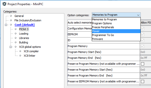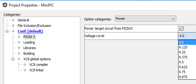 Da MPLAB aprire Run/Set Project Configuration/Customize. Si aprirà questa schermata, cliccare su PICkit 3 e selezionare Power dalla tendina Option Categories.