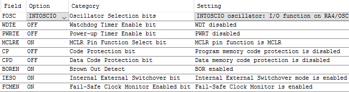 #pragma config FOSC = INTOSCIO // Oscillator Selection bits (INTOSCIO oscillator: I/O function on RA4/OSC2/CLKOUT pin, I/O function on RA5/OSC1/CLKIN)