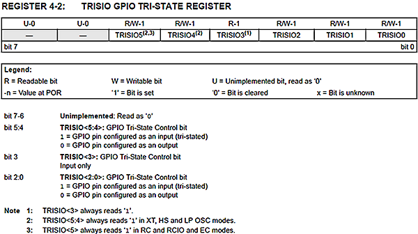 Per impostare tutte le porte come output, eccetto GP3 che è sempre un input. Notare come i primi due bit del registro TRISIO siano inutilizzati. Attenzione a GP3 che può fungere solo da input.