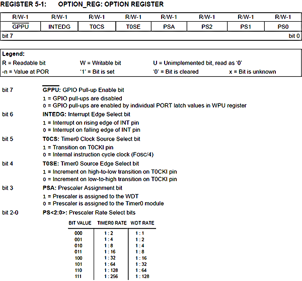 . Possiamo impostare il prescaler fino a 1:256, ottenendo un periodo di overflow massimo di 32.768 ms. Per impostare il prescaler dobbiamo agire sul registro OPTION_REG: