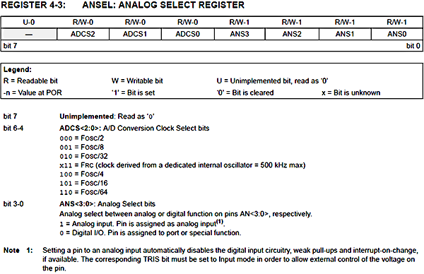 Nel caso si voglia utilizzare come I/O digitale le porte GP0, GP1, GP2 e GP3 bisogna settare a 0 i bit ANS0, ANS1, ANS2, ANS3 del registro ANSEL: