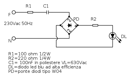 Il circuito che ho disegnato sopra rappresenta il collegamento di un led (ad alta efficienza) alla rete-luce. Quello che mi interessa è la presenza o meglio il funzionamento di quel condensatore (C1) così collegato. Allora sappiamo che la FREQUENZA della tensione che giunge alle utenze domestiche è di 50Hz. La mia domanda è: in questo caso quel condensatore come funziona, a cosa serve? Quello che “SUPPONGO” di sapere è che innanzitutto la resistenza che si trova prima del condensatore serve per limitare la corrente su quel ramo o meglio funge da fusibile, il condensatore si carica e scarica alla frequenza di rete permettendo la circolazione di corrente nel circuito. Se al ponte diodi arriva sempre una corrente alternata cosa comporta la presenza di quel condensatore o meglio se non è presente cosa accade?