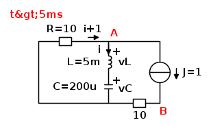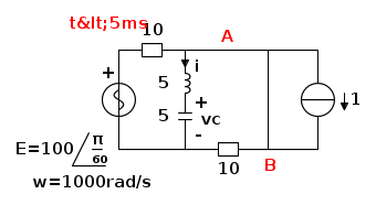 La sovrapposizione degli effetti ci avrebbe portato subito a vedere che la soluzione era in realta' molto piu' semplice, bastava notare che la chiusura dell'interruttore non veniva ad influenzare il regime permanente sinusoidale grazie alla risonansa del ramo LC, e di conseguenza la tensione ai capi dell'interruttore risulta dipendente unicamente dal generatore di corrente ed e' indipendente da quello di tensione.