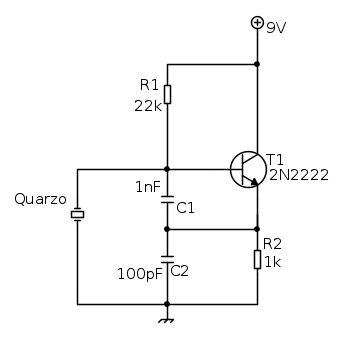 Si tratta di un oscillatore Colpitts, è adatto ad oscillare a varie frequenze ( in questo caso dipendenti dal tipo di quarzo utilizzato ).