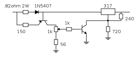 la seconda direi che si possa ottenere con la solita resistenza di caduta, e tramite la sua lettura si deve ridurre la tensione in uscita magari pilotando in apertura la resistenza verso massa del tuo stabilizzatore, (il valore minimo di tensione ottenibile non sarà zero).