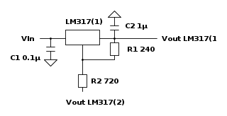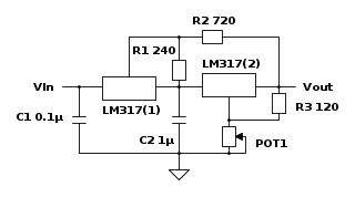 E siccome è noto il comportamento del secondo LM317 (il # 2), bisogna cercare di capire come si comporta il primo LM317, provando a ragionare su questo schema, così:
