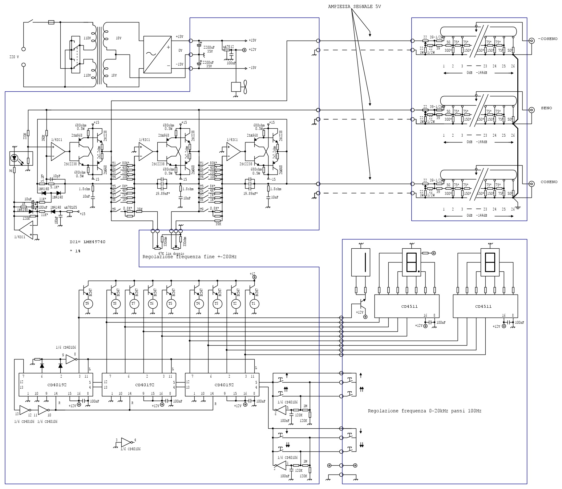 Il numero di relè mi ricorda l'oscillatore a ponte di Wien che mi ero fatto a 18 anni: andava da 10 Hz a 40 kHz in 3 bande e la selezione della frequenza era fatta da relè pilotati da contraves con 3 cifre.