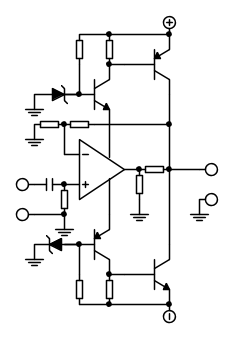 Se si guarda bene la configurazione dei due transistori, si vede che sono in configurazione Sziklai, oppure anche detta Darlington complementare o ancora CFP (Complementary Feedback Pair).