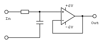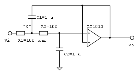 La cosa si complica con i filtri attivi. A parte trovare l'OP con una banda passante adeguata (nel mio caso non ho prb), devo considerare che non accettano componenti continue in ingresso.