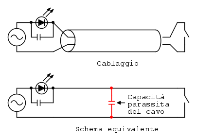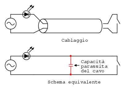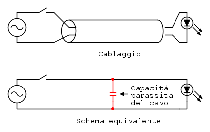 Sono le capacità parassite tra i conduttori a dare questi problemi, il cui valore dipende molto da come è fatto il cablaggio e da quanto è esteso, quindi difficilmente stimabile ma in genere dell’ordine di decine/centinaia di pF.