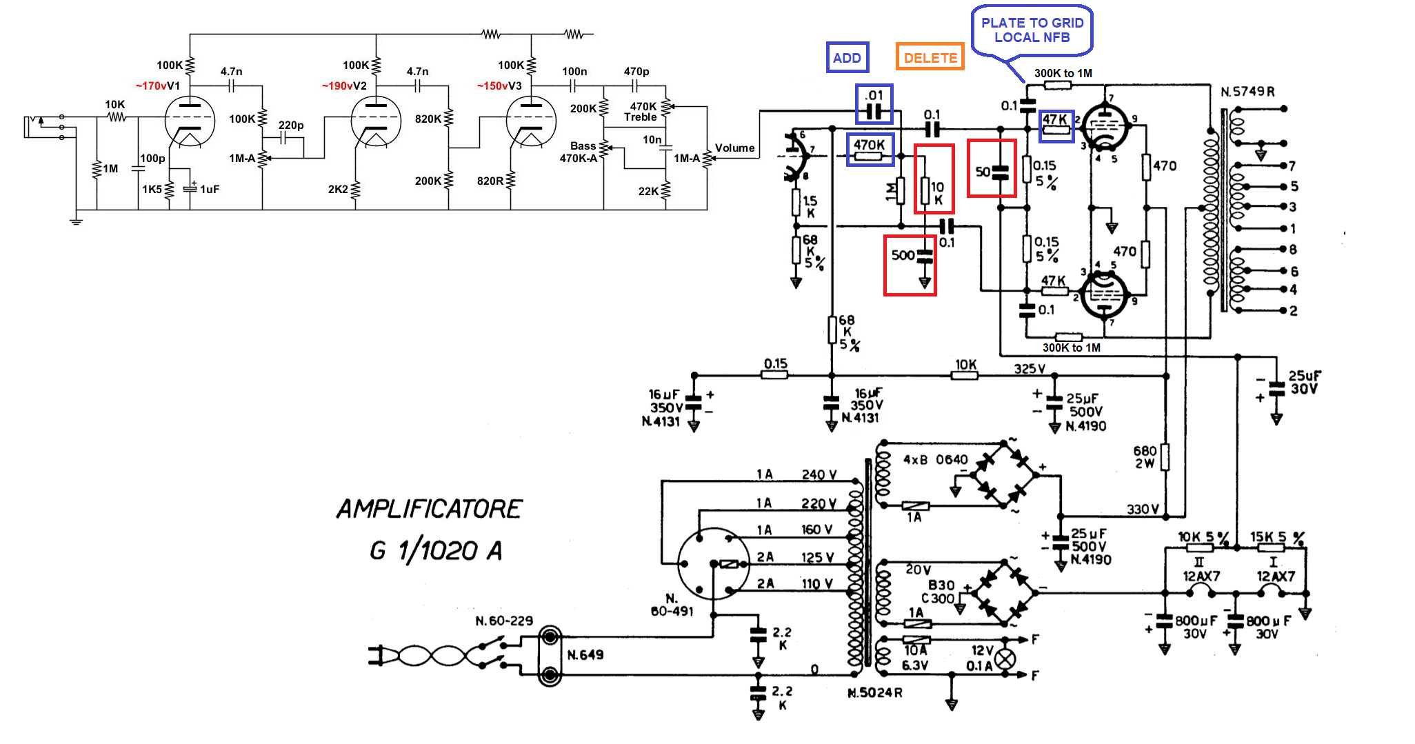 Un forumer di EL34World (dove bazzico da anni) mi ha disegnato una mod che risolve altre cose, separa la Concertina dal Master Volume, previene la Bloking Distortion, reduce l'HF Roll-Off (mannaggia se mi ricordassi cos'è sta cosa che ha a che fare con l'Alta Frequenza) e, dulcis in fundo, crea un Feedback Locale sulle finali (la resistenza con in serie il condensatore tra la placca e G1)