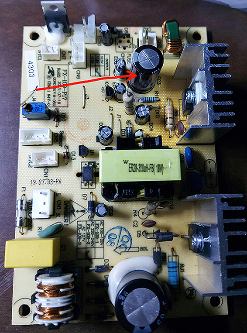 Nella foto con la freccia rossa è segnalato il condensatore che ho sostituito e che si è gonfiato in un attimo.