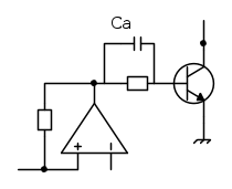 Non so con che corrente comandi il transistore e da quanto sia la resistenza, direi di provare con Ca=3.3nF o giu` di li`.