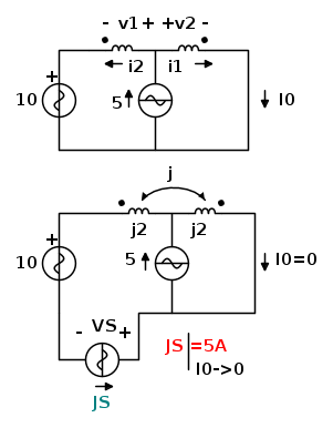 ![10=V_{1}-V_{2}=\left[ j2(5-I_{0})+jI_{0} \right]-\left[ j2I_{0}+j(5-I_{0}) \right]\,\,\,\to I_{0}=\frac{5}{2}\,-j5 10=V_{1}-V_{2}=\left[ j2(5-I_{0})+jI_{0} \right]-\left[ j2I_{0}+j(5-I_{0}) \right]\,\,\,\to I_{0}=\frac{5}{2}\,-j5](/forum/latexrender/pictures/09c228a2662ff95132ff8bdeb6a73ecd.png)