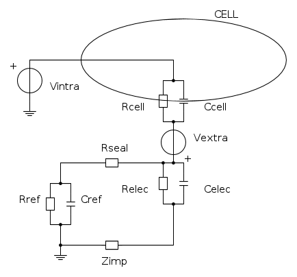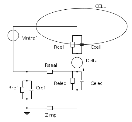 Ovvero, per me c'è l'elettrodo di riferimento che fissa una tensione a tutta la brodaglia. Ovviamente non sarà perfetto per cui ci sarà una resistenza ed una capacità parassita a questo elettrodo (Rref e Cref). Per di più, ci sarà una imperfezione dovuta all'incapsulamento, quindi qualche elettrone potrà scambiarsi tra l'elettrodo di riferimento a quello di misura (Rseal). Da un punto di vista più legato alla biologia, avremo un potenziale intracellulare rispetto a quello del brodo imposto dal potenziale di riferimento. L'ho chiamato Vintra' perché non so se sia lo stesso di quello descritto dagli autori dell'articolo. Dato che noi non vogliamo trapassare la cellula con un elettrodo, accediamo al potenziale extracellulare, ovvero quello a cui si arriva oltrepassando la membrana cellulare (conduttiva ma non troppo Rcell e Ccell) più un qualcos'altro che non so che dà luogo ad un'ulteriore differenza che ho chiamato Delta.