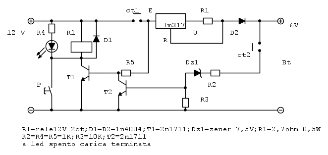 l'LM317 è utilizzato come generatore di tensione costante, da regolare tramite R3 a 7,35-7,5 V, tensioni indicate sulla batteria.