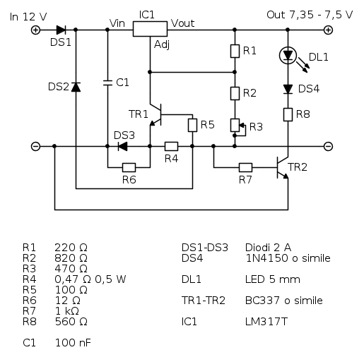 R4, R5 e TR1 abbassano la tensione sul piedino di regolazione quando la corrente raggiunge 1,2 A, dando quindi la limitazione in corrente.