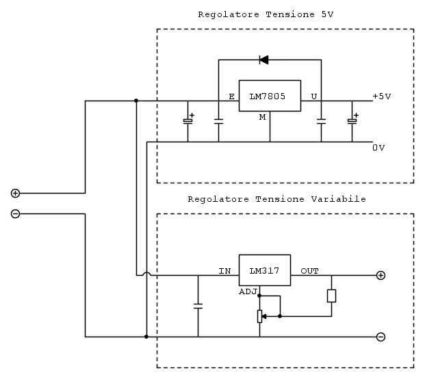 In breve, avrò una circuiteria per darmi i 5V ed una per darmi una tensione variabile ed entrambe le uscite le collego alle relative boccole che fisserò sul case (che in questo caso non è altri che un case di alimentatore da PC, oramai defunto).