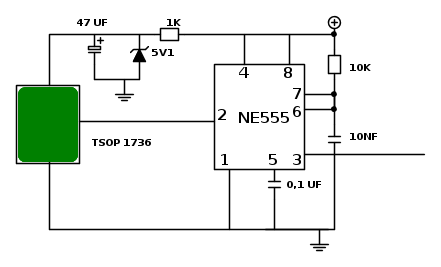 Ciao :) Appreso significato di collegamento flottante,kmq non posso ancora vericare se il condensatore mantiene la carica poiché sto aspettando che mi arrivano le resistenze all'1% quindi non ho montato il trasmittente (anche se per verificarlo le resistenze non servirebbere perche è da vericare con pulsante aperto),ho fatto qualcosa riguardo il ricevente, come tsop ho scelto un TSOP1736 , = 36 kHz alimentato a 5 vcc, per cui ho messo uno zener,