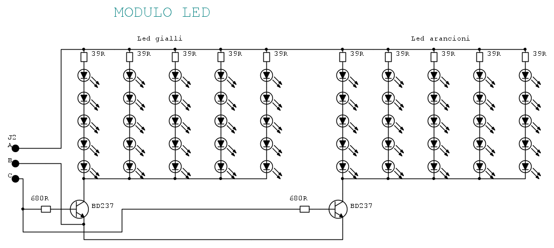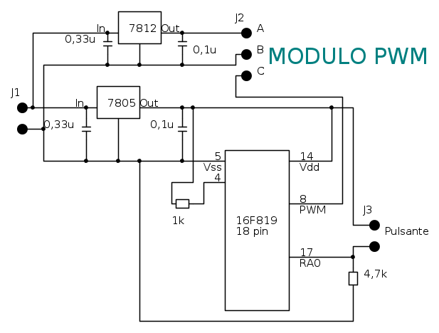 DESCRIZIONE: Oltre all'uscita del segnale PWM, vi sono anche due regolatori di tensione lineari per l'alimentazione del micro e, per le serie di led che saranno alimentate dal 7812.