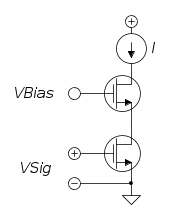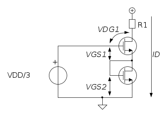 Si` saturazione, ma non generatore di corrente perche' c'e` una retroazione. Se i due MOS sono uguali, il MOS di sotto ha l'effetto per il bias di raddoppiare la tensione di gate del primo MOS (ho detto tensione di gate, non Vgs) necessaria per avere una corrente preassegnata. Invece dal punto di vista del piccolo segnale dimezza il guadagno del soure comune, rispetto al caso di source collegato direttamente al potenziale di riferimento.