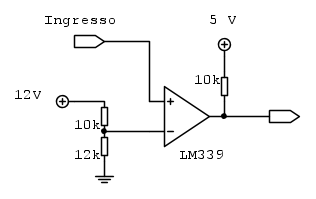 Allora, il circuito è un comparatore di soglia. La soglia è determinata dalle prime due resistenze di sinistra, che costituiscono un partitore. Se tu alimenti il partitore con 12 V avrai, con la solita formuletta, una tensione di circa 6.54 V all'ingresso invertente del LM339. All'ingresso non invertente avrai il tuo segnale. Se il segnale è a livello 5 V, avrai che l'ingresso non invertente è a tensione più bassa di quello invertente, quindi l'uscita è bassa (0 V). Se invece il tuo segnale è a 10 V (quindi oltre i 6.54 V di soglia), l'ingresso non invertente è a tensione più alta di quello invertente, e l'uscita va alta.