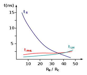 che in buona sostanza assume un significato similare al fattore di forma per gli invertitori NMOS. Se indichiamo adesso con A il rapporto in tensione V_{CC}/V_{BESAT}, otteniamo le seguenti espressioni per i ritardi di propagazione: