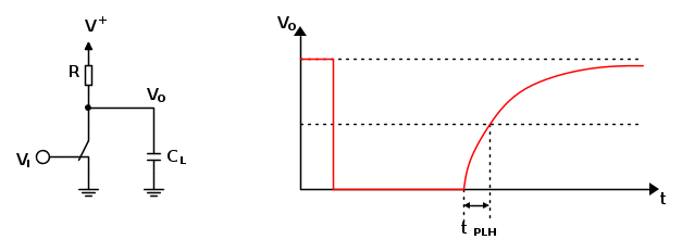 Il ritardo di propagazione dell'invertitore, considerando che il segnale applicato all'ingresso di controllo sia anch'esso idealizzato con tempi di salita e discesa perfettamente nulli, sarà funzione del solo tempo che impiega la capacità di carico C_{L} a caricarsi per mezzo di R, in quanto la scarica avviene in un tempo nullo attraverso l'interruttore chiuso in cortocircuito con il potenziale di riferimento. Il ritardo allora sarà proporzionale alla costante di tempo di carica RC_{L} e dato dalla seguente espressione: