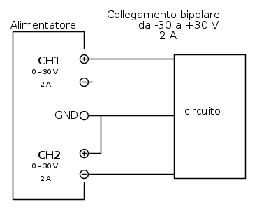 Il collegamento a terra può essere fatto sia alla boccola del polo positivo che a quella del polo negativo, dipende da quale polo di alimentazione del circuito in prova si vuole che sia a potenziale nullo rispetto al conduttore di terra.